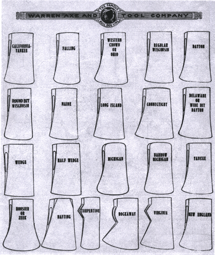 Notice the 21 different styles of modern (1916) steel ax heads and consider what we might infer about their construction and functionality?