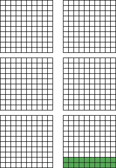 Thought of five and eight tenths as a decimal, drew a representation for five and eight tenths to include a representation of five and 80 hundredths (green represents crossed out pieces). Continued