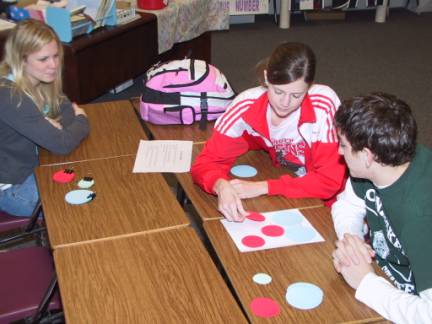 Lauren questions Adam Õs last move on the game board while Derek tries to lay the last circle as Jenna closely watches for legal moves.
