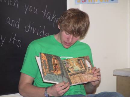 Nolan reads ÒSir Cumference and the Dragon of PiÓ to the Algebra 2 students. In this book Radius saves his father, Sir Cumference, from a terrible curse by discovering the equivalent measure of pi.