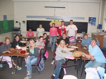 The Advanced Math class posed in the seating arrangement of the Greek letter pi and displayed a few of their pies that they brought for pi day.