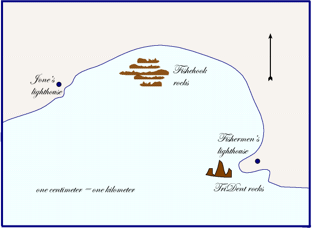 Locate all points that are 5 km from Jones lighthouse. Locate all points that are 8 km from Fishermen’s lighthouse. Mark with an X at the point or points where the ship might be. Decide if and where, if any, place(s) that you would send a search crew )