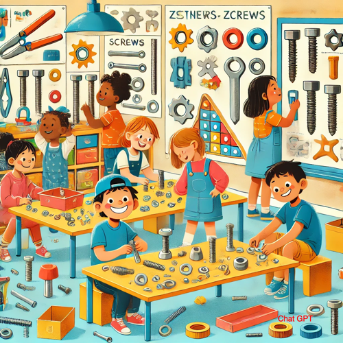 - Make an illustration of young kids in a learning center exploring how fasteners like ties, buttons, zippers, buckles, Velcro, bobby pins, barrettes, ribbons, pins, clasps, jewelry, staples, paper clips, glue, rubber bands, tacks, nails, screws, paper fasteners, yarn, thread, doorknobs, latches, magnets, picture hooks, flannel boards, hinges, padlocks, cement, keystones, rivets, seat belts, and gravity works.