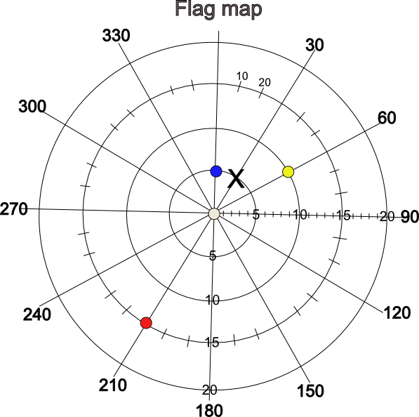When they did they found the blue flag was 30 degrees and, 5 paces so marked their polar map with an X.