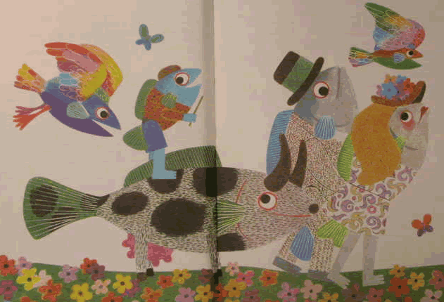 A minnow and a tadpole grew up together in a pond. One day the tadpole began to change. When fish realized the tadpole would become a frog, he wanted the frog to return after being outside the pond and describe what life outside the pond is like. The frog explored the world and as asked returned to described the world, birds, people, and cows. Below is the mental picture the fish imagined from the frog's descriptions.